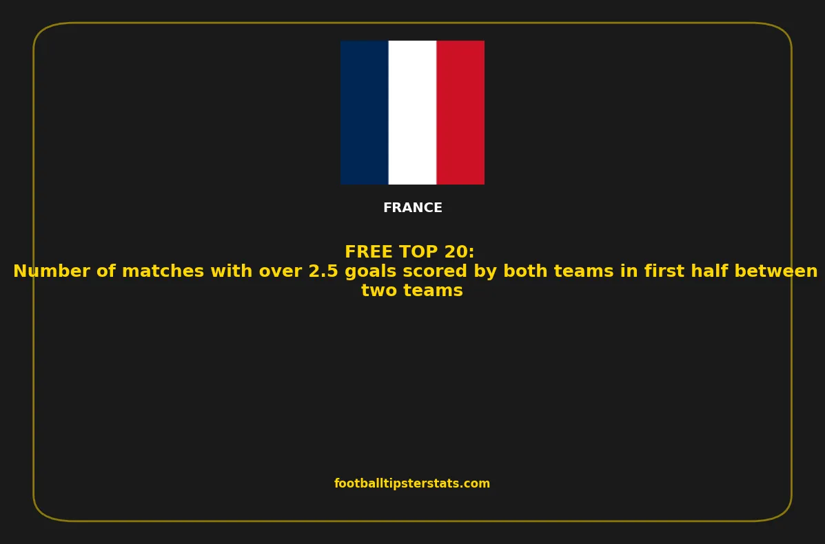 Here is a detailed overview of the teams with the highest number of matches with over 2.5 goals scored by both teams in first half between two teams in France. This list highlights clubs that consistently produce high-scoring games, based on recent statistical performance. Whether you're analyzing trends, preparing betting strategies, or simply exploring offensive team profiles, these numbers offer a clear insight into which teams generate the most goal-rich matches.