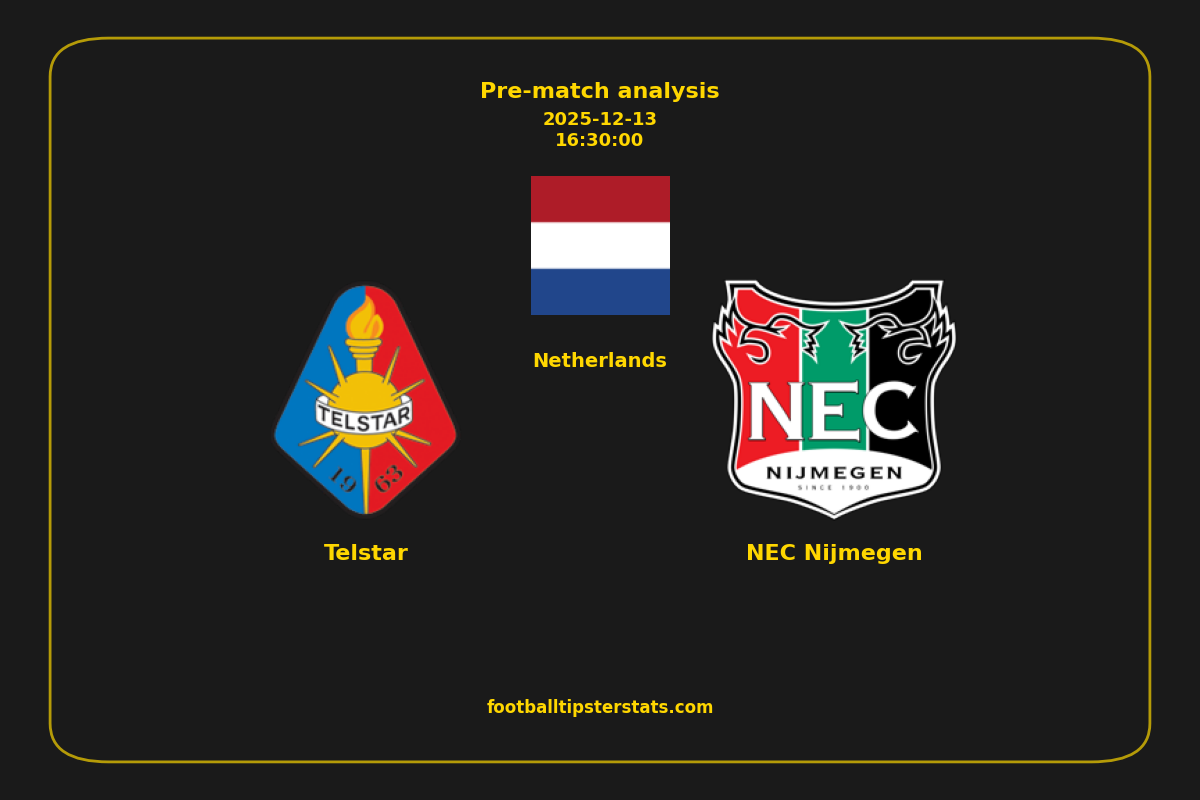 Analyzing the recent performance of Telstar and NEC Nijmegen in Netherlands, we can derive insights that may inform future match predictions. By examining their individual game histories, head-to-head encounters, and overall trends, we can identify patterns that highlight strengths and weaknesses for both teams. This comprehensive review aims to provide a clearer understanding of their competitive dynamics and potential outcomes in upcoming fixtures.This pre-match analysis covers the upcoming fixture between Telstar and NEC Nijmegen. Below you’ll find a detailed breakdown of both teams’ recent form, goal statistics, and head-to-head performance. These insights provide a clear picture of current momentum and can be valuable for match forecasting, tactical evaluation, or betting analysis. Please note that these suggestions are based on historical data and trends. While they provide valuable insights, actual match outcomes can be influenced by various unpredictable factors. Always consider multiple aspects before making any decisions based on these analyses.