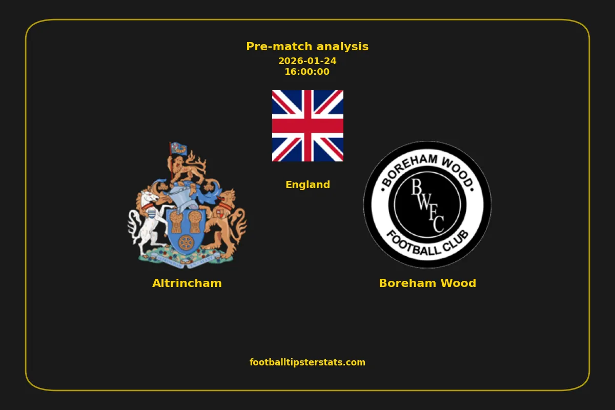 Analyzing the recent performance of Altrincham and Boreham Wood in England, we can derive insights that may inform future match predictions. By examining their individual game histories, head-to-head encounters, and overall trends, we can identify patterns that highlight strengths and weaknesses for both teams. This comprehensive review aims to provide a clearer understanding of their competitive dynamics and potential outcomes in upcoming fixtures.This pre-match analysis covers the upcoming fixture between Altrincham and Boreham Wood. Below you’ll find a detailed breakdown of both teams’ recent form, goal statistics, and head-to-head performance. These insights provide a clear picture of current momentum and can be valuable for match forecasting, tactical evaluation, or betting analysis. Please note that these suggestions are based on historical data and trends. While they provide valuable insights, actual match outcomes can be influenced by various unpredictable factors. Always consider multiple aspects before making any decisions based on these analyses.