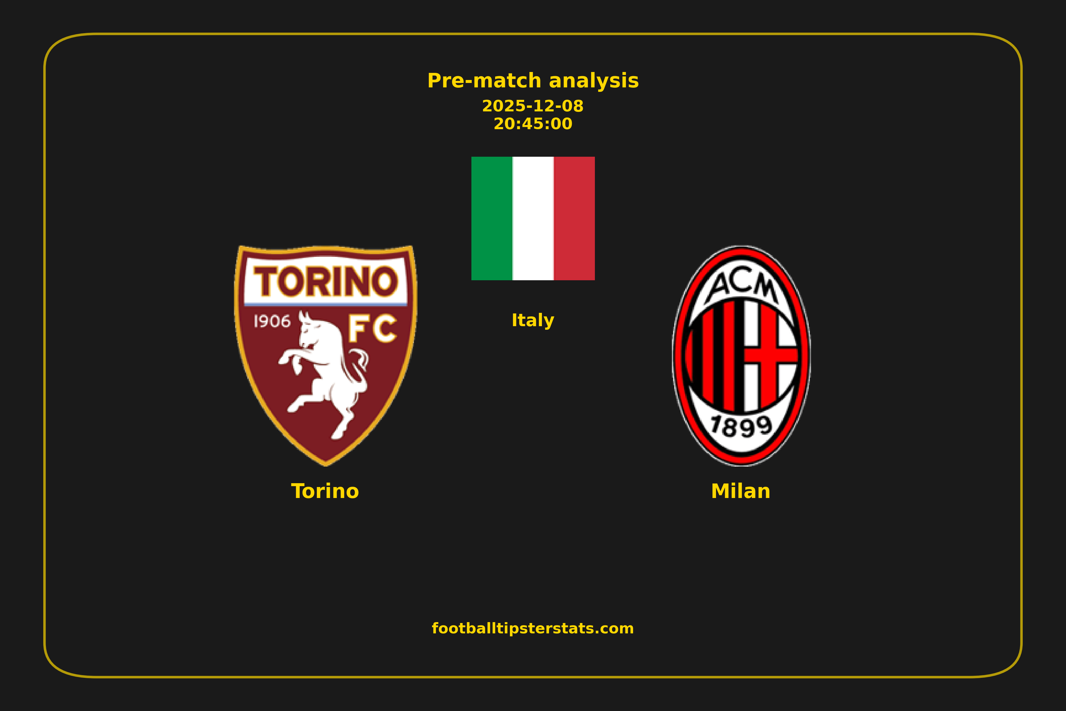 Analyzing the recent performance of Torino and Milan in Italy, we can derive insights that may inform future match predictions. By examining their individual game histories, head-to-head encounters, and overall trends, we can identify patterns that highlight strengths and weaknesses for both teams. This comprehensive review aims to provide a clearer understanding of their competitive dynamics and potential outcomes in upcoming fixtures.This pre-match analysis covers the upcoming fixture between Torino and Milan. Below you’ll find a detailed breakdown of both teams’ recent form, goal statistics, and head-to-head performance. These insights provide a clear picture of current momentum and can be valuable for match forecasting, tactical evaluation, or betting analysis. Please note that these suggestions are based on historical data and trends. While they provide valuable insights, actual match outcomes can be influenced by various unpredictable factors. Always consider multiple aspects before making any decisions based on these analyses.