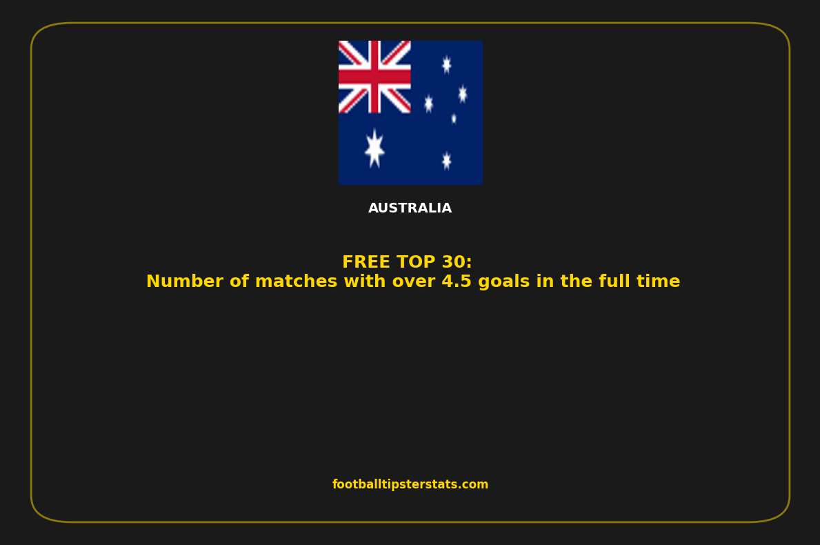 Here is a detailed overview of the teams with the highest number of matches with over 4.5 goals in the full time in Australia. This list highlights clubs that consistently produce high-scoring games, based on recent statistical performance. Whether you're analyzing trends, preparing betting strategies, or simply exploring offensive team profiles, these numbers offer a clear insight into which teams generate the most goal-rich matches.