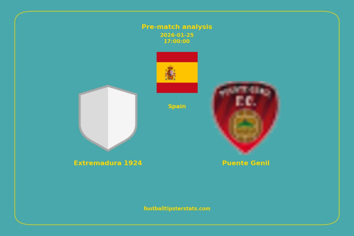 Analyzing the recent performance of Extremadura 1924 and Puente Genil in Spain, we can derive insights that may inform future match predictions. By examining their individual game histories, head-to-head encounters, and overall trends, we can identify patterns that highlight strengths and weaknesses for both teams. This comprehensive review aims to provide a clearer understanding of their competitive dynamics and potential outcomes in upcoming fixtures.This pre-match analysis covers the upcoming fixture between Extremadura 1924 and Puente Genil. Below you’ll find a detailed breakdown of both teams’ recent form, goal statistics, and head-to-head performance. These insights provide a clear picture of current momentum and can be valuable for match forecasting, tactical evaluation, or betting analysis. Please note that these suggestions are based on historical data and trends. While they provide valuable insights, actual match outcomes can be influenced by various unpredictable factors. Always consider multiple aspects before making any decisions based on these analyses.
