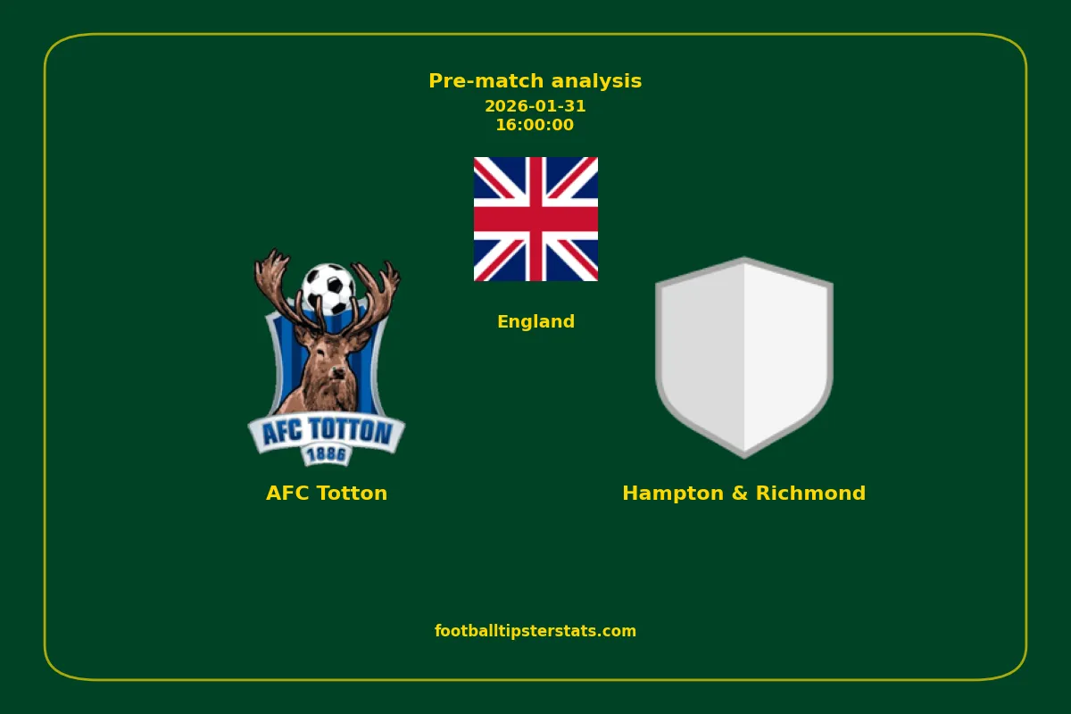 Analyzing the recent performance of AFC Totton and Hampton & Richmond in England, we can derive insights that may inform future match predictions. By examining their individual game histories, head-to-head encounters, and overall trends, we can identify patterns that highlight strengths and weaknesses for both teams. This comprehensive review aims to provide a clearer understanding of their competitive dynamics and potential outcomes in upcoming fixtures.This pre-match analysis covers the upcoming fixture between AFC Totton and Hampton & Richmond. Below you’ll find a detailed breakdown of both teams’ recent form, goal statistics, and head-to-head performance. These insights provide a clear picture of current momentum and can be valuable for match forecasting, tactical evaluation, or betting analysis. Please note that these suggestions are based on historical data and trends. While they provide valuable insights, actual match outcomes can be influenced by various unpredictable factors. Always consider multiple aspects before making any decisions based on these analyses.