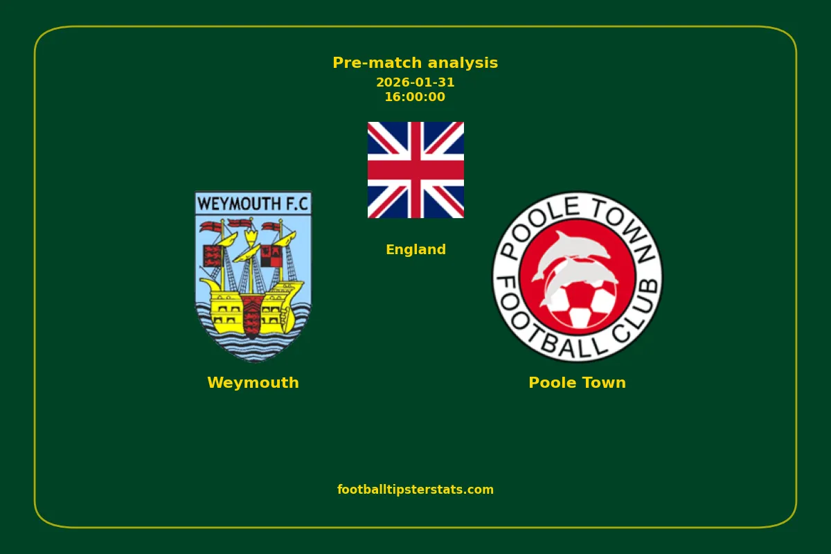 Analyzing the recent performance of Weymouth and Poole Town in England, we can derive insights that may inform future match predictions. By examining their individual game histories, head-to-head encounters, and overall trends, we can identify patterns that highlight strengths and weaknesses for both teams. This comprehensive review aims to provide a clearer understanding of their competitive dynamics and potential outcomes in upcoming fixtures.This pre-match analysis covers the upcoming fixture between Weymouth and Poole Town. Below you’ll find a detailed breakdown of both teams’ recent form, goal statistics, and head-to-head performance. These insights provide a clear picture of current momentum and can be valuable for match forecasting, tactical evaluation, or betting analysis. Please note that these suggestions are based on historical data and trends. While they provide valuable insights, actual match outcomes can be influenced by various unpredictable factors. Always consider multiple aspects before making any decisions based on these analyses.