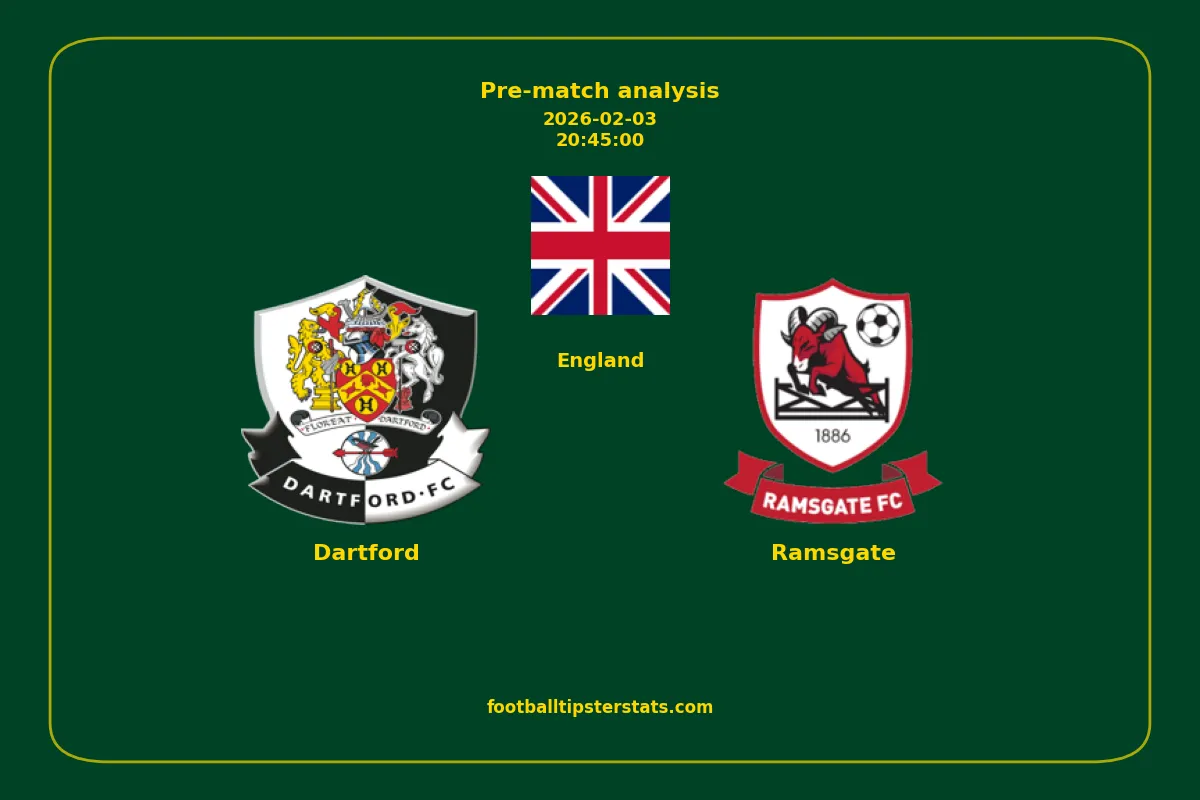 Analyzing the recent performance of Dartford and Ramsgate in England, we can derive insights that may inform future match predictions. By examining their individual game histories, head-to-head encounters, and overall trends, we can identify patterns that highlight strengths and weaknesses for both teams. This comprehensive review aims to provide a clearer understanding of their competitive dynamics and potential outcomes in upcoming fixtures.This pre-match analysis covers the upcoming fixture between Dartford and Ramsgate. Below you’ll find a detailed breakdown of both teams’ recent form, goal statistics, and head-to-head performance. These insights provide a clear picture of current momentum and can be valuable for match forecasting, tactical evaluation, or betting analysis. Please note that these suggestions are based on historical data and trends. While they provide valuable insights, actual match outcomes can be influenced by various unpredictable factors. Always consider multiple aspects before making any decisions based on these analyses.