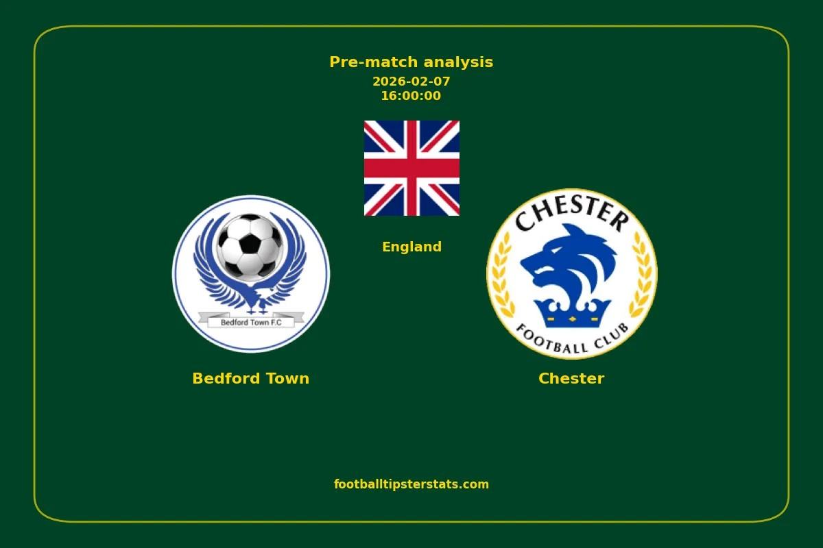 Analyzing the recent performance of Bedford Town and Chester in England, we can derive insights that may inform future match predictions. By examining their individual game histories, head-to-head encounters, and overall trends, we can identify patterns that highlight strengths and weaknesses for both teams. This comprehensive review aims to provide a clearer understanding of their competitive dynamics and potential outcomes in upcoming fixtures.This pre-match analysis covers the upcoming fixture between Bedford Town and Chester. Below you’ll find a detailed breakdown of both teams’ recent form, goal statistics, and head-to-head performance. These insights provide a clear picture of current momentum and can be valuable for match forecasting, tactical evaluation, or betting analysis. Please note that these suggestions are based on historical data and trends. While they provide valuable insights, actual match outcomes can be influenced by various unpredictable factors. Always consider multiple aspects before making any decisions based on these analyses.
