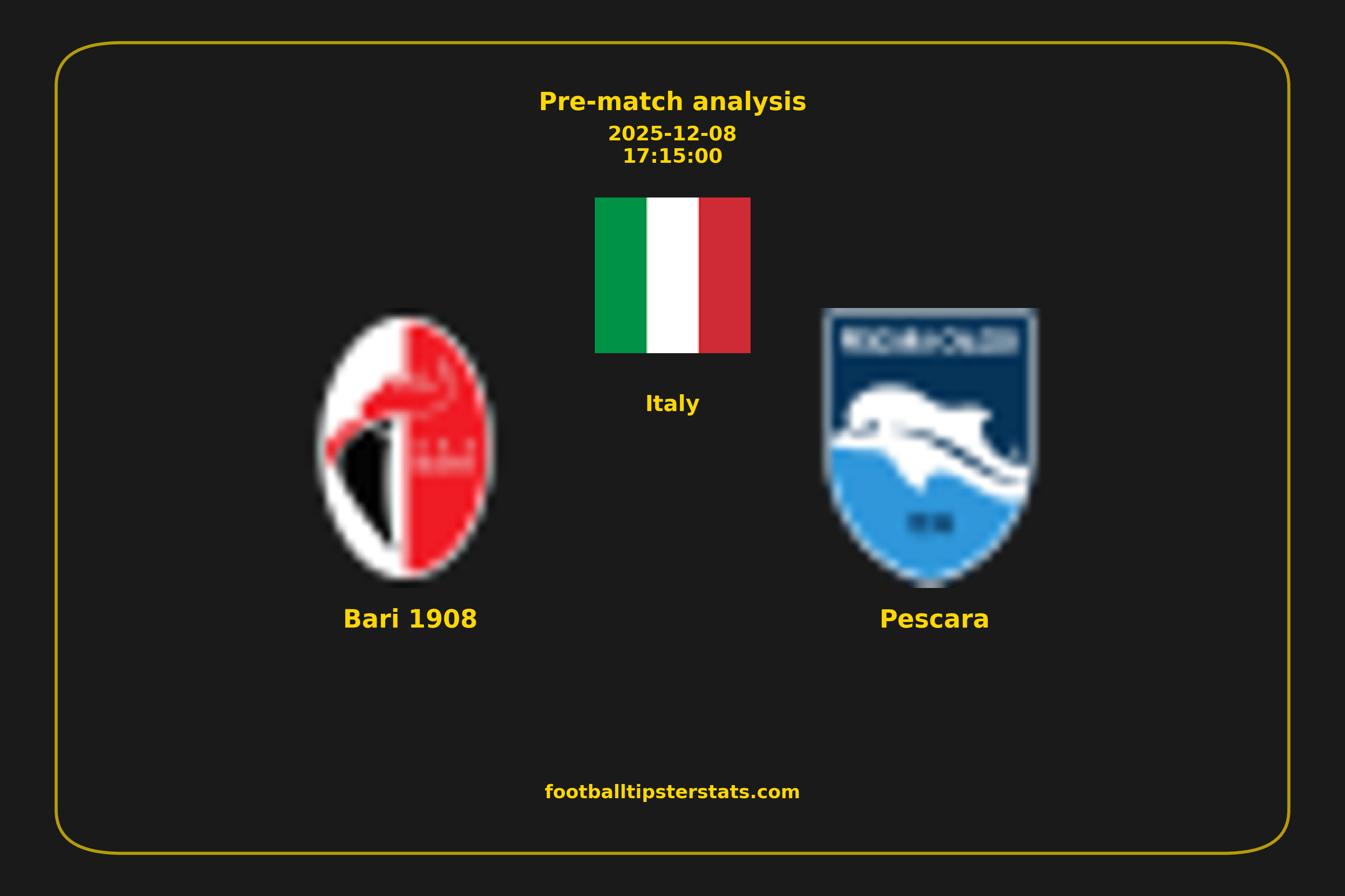 Analyzing the recent performance of Bari 1908 and Pescara in Italy, we can derive insights that may inform future match predictions. By examining their individual game histories, head-to-head encounters, and overall trends, we can identify patterns that highlight strengths and weaknesses for both teams. This comprehensive review aims to provide a clearer understanding of their competitive dynamics and potential outcomes in upcoming fixtures.This pre-match analysis covers the upcoming fixture between Bari 1908 and Pescara. Below you’ll find a detailed breakdown of both teams’ recent form, goal statistics, and head-to-head performance. These insights provide a clear picture of current momentum and can be valuable for match forecasting, tactical evaluation, or betting analysis. Please note that these suggestions are based on historical data and trends. While they provide valuable insights, actual match outcomes can be influenced by various unpredictable factors. Always consider multiple aspects before making any decisions based on these analyses.