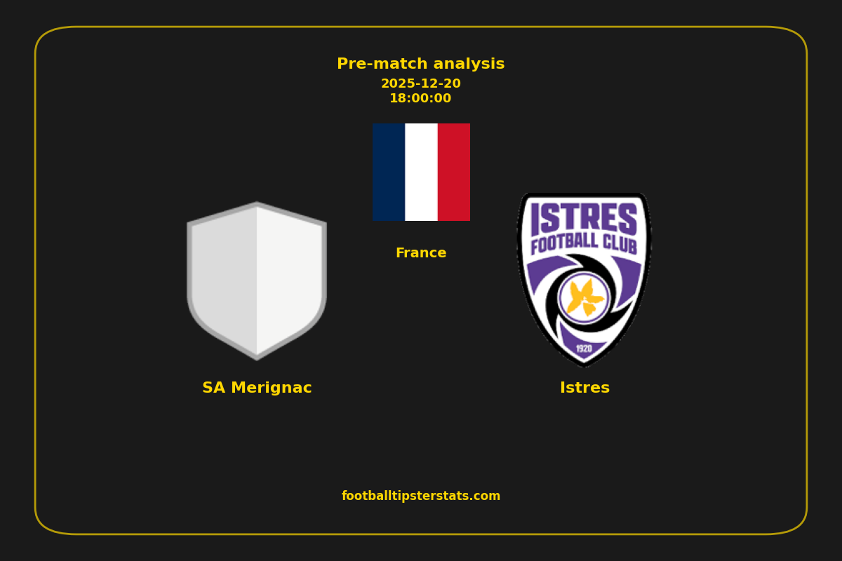 Analyzing the recent performance of SA Merignac and Istres in France, we can derive insights that may inform future match predictions. By examining their individual game histories, head-to-head encounters, and overall trends, we can identify patterns that highlight strengths and weaknesses for both teams. This comprehensive review aims to provide a clearer understanding of their competitive dynamics and potential outcomes in upcoming fixtures.This pre-match analysis covers the upcoming fixture between SA Merignac and Istres. Below you’ll find a detailed breakdown of both teams’ recent form, goal statistics, and head-to-head performance. These insights provide a clear picture of current momentum and can be valuable for match forecasting, tactical evaluation, or betting analysis. Please note that these suggestions are based on historical data and trends. While they provide valuable insights, actual match outcomes can be influenced by various unpredictable factors. Always consider multiple aspects before making any decisions based on these analyses.
