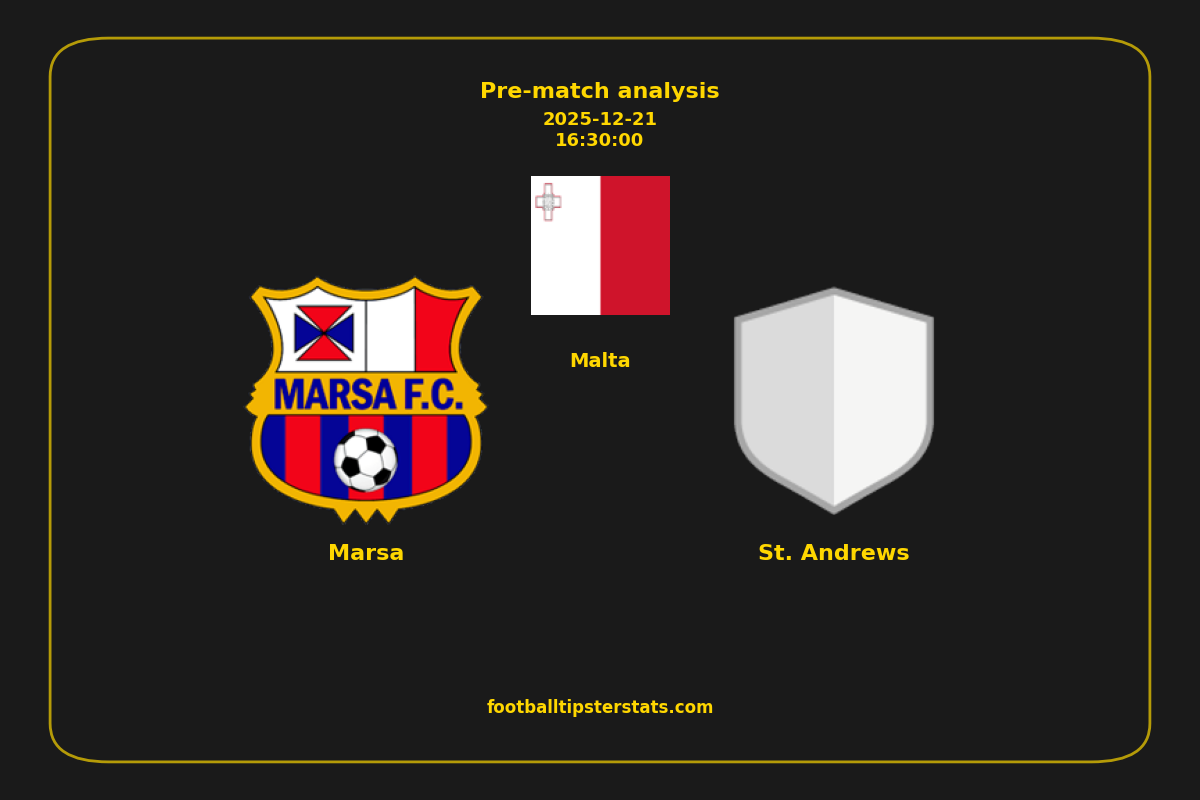Analyzing the recent performance of Marsa and St. Andrews in Malta, we can derive insights that may inform future match predictions. By examining their individual game histories, head-to-head encounters, and overall trends, we can identify patterns that highlight strengths and weaknesses for both teams. This comprehensive review aims to provide a clearer understanding of their competitive dynamics and potential outcomes in upcoming fixtures.This pre-match analysis covers the upcoming fixture between Marsa and St. Andrews. Below you’ll find a detailed breakdown of both teams’ recent form, goal statistics, and head-to-head performance. These insights provide a clear picture of current momentum and can be valuable for match forecasting, tactical evaluation, or betting analysis. Please note that these suggestions are based on historical data and trends. While they provide valuable insights, actual match outcomes can be influenced by various unpredictable factors. Always consider multiple aspects before making any decisions based on these analyses.