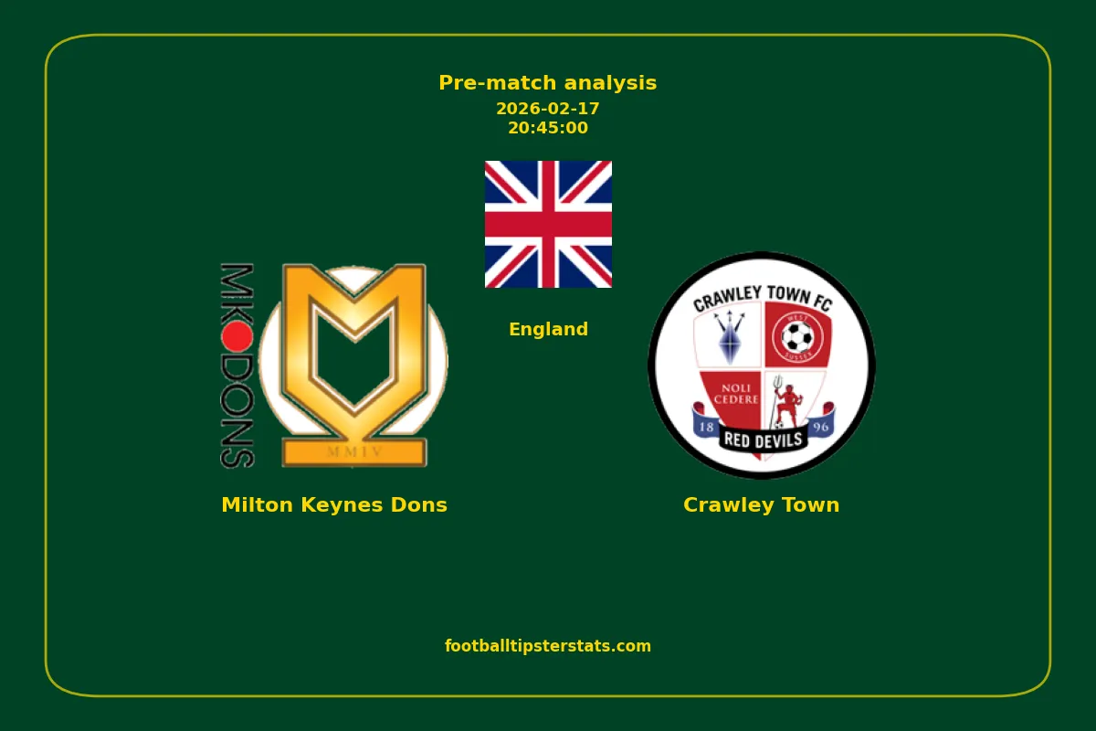 Analyzing the recent performance of Milton Keynes Dons and Crawley Town in England, we can derive insights that may inform future match predictions. By examining their individual game histories, head-to-head encounters, and overall trends, we can identify patterns that highlight strengths and weaknesses for both teams. This comprehensive review aims to provide a clearer understanding of their competitive dynamics and potential outcomes in upcoming fixtures.This pre-match analysis covers the upcoming fixture between Milton Keynes Dons and Crawley Town. Below you’ll find a detailed breakdown of both teams’ recent form, goal statistics, and head-to-head performance. These insights provide a clear picture of current momentum and can be valuable for match forecasting, tactical evaluation, or betting analysis. Please note that these suggestions are based on historical data and trends. While they provide valuable insights, actual match outcomes can be influenced by various unpredictable factors. Always consider multiple aspects before making any decisions based on these analyses.