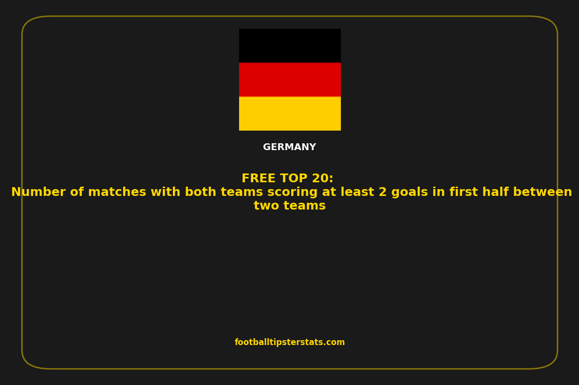Here is a detailed overview of the teams with the highest number of matches with both teams scoring at least 2 goals in first half between two teams in Germany. This list highlights clubs that consistently produce high-scoring games, based on recent statistical performance. Whether you're analyzing trends, preparing betting strategies, or simply exploring offensive team profiles, these numbers offer a clear insight into which teams generate the most goal-rich matches.