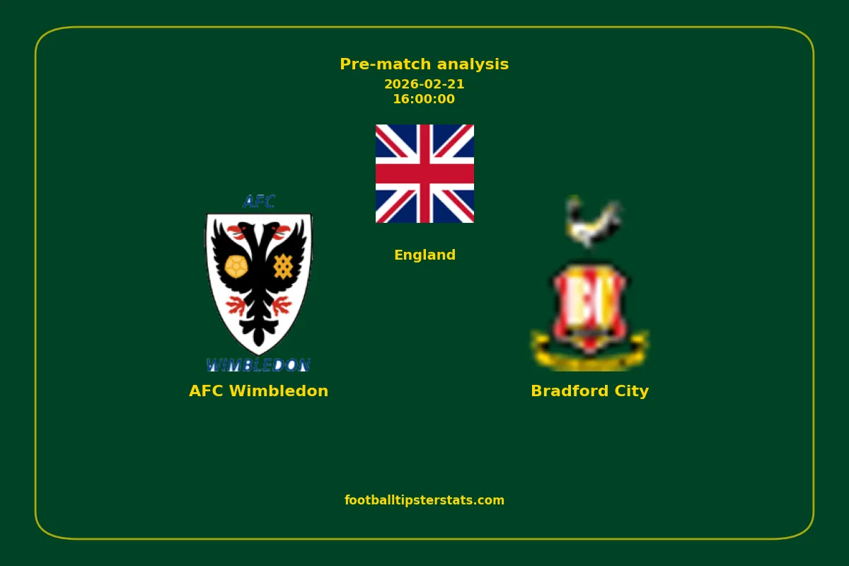 Analyzing the recent performance of AFC Wimbledon and Bradford City in England, we can derive insights that may inform future match predictions. By examining their individual game histories, head-to-head encounters, and overall trends, we can identify patterns that highlight strengths and weaknesses for both teams. This comprehensive review aims to provide a clearer understanding of their competitive dynamics and potential outcomes in upcoming fixtures.This pre-match analysis covers the upcoming fixture between AFC Wimbledon and Bradford City. Below you’ll find a detailed breakdown of both teams’ recent form, goal statistics, and head-to-head performance. These insights provide a clear picture of current momentum and can be valuable for match forecasting, tactical evaluation, or betting analysis. Please note that these suggestions are based on historical data and trends. While they provide valuable insights, actual match outcomes can be influenced by various unpredictable factors. Always consider multiple aspects before making any decisions based on these analyses.
