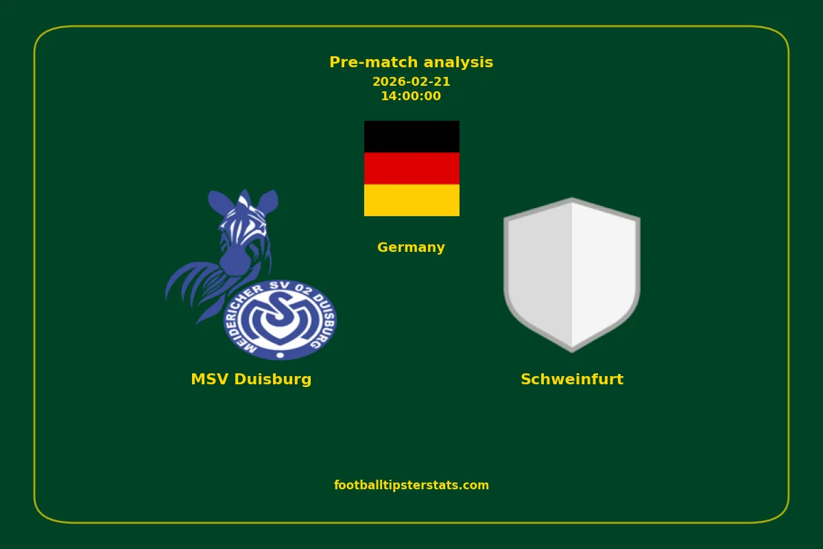Analyzing the recent performance of MSV Duisburg and Schweinfurt in Germany, we can derive insights that may inform future match predictions. By examining their individual game histories, head-to-head encounters, and overall trends, we can identify patterns that highlight strengths and weaknesses for both teams. This comprehensive review aims to provide a clearer understanding of their competitive dynamics and potential outcomes in upcoming fixtures.This pre-match analysis covers the upcoming fixture between MSV Duisburg and Schweinfurt. Below you’ll find a detailed breakdown of both teams’ recent form, goal statistics, and head-to-head performance. These insights provide a clear picture of current momentum and can be valuable for match forecasting, tactical evaluation, or betting analysis. Please note that these suggestions are based on historical data and trends. While they provide valuable insights, actual match outcomes can be influenced by various unpredictable factors. Always consider multiple aspects before making any decisions based on these analyses.