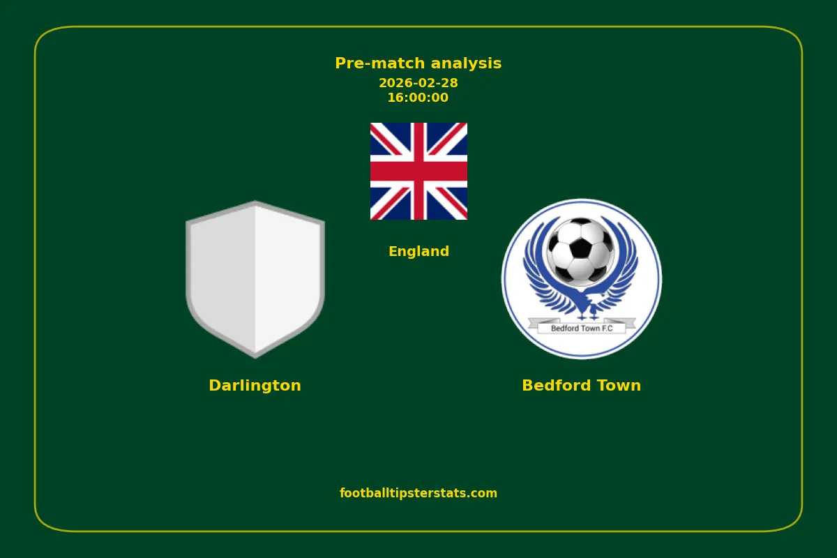 Analyzing the recent performance of Darlington and Bedford Town in England, we can derive insights that may inform future match predictions. By examining their individual game histories, head-to-head encounters, and overall trends, we can identify patterns that highlight strengths and weaknesses for both teams. This comprehensive review aims to provide a clearer understanding of their competitive dynamics and potential outcomes in upcoming fixtures.This pre-match analysis covers the upcoming fixture between Darlington and Bedford Town. Below you’ll find a detailed breakdown of both teams’ recent form, goal statistics, and head-to-head performance. These insights provide a clear picture of current momentum and can be valuable for match forecasting, tactical evaluation, or betting analysis. Please note that these suggestions are based on historical data and trends. While they provide valuable insights, actual match outcomes can be influenced by various unpredictable factors. Always consider multiple aspects before making any decisions based on these analyses.