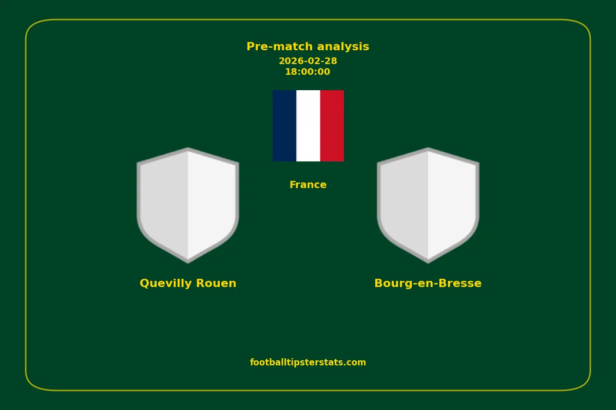 Analyzing the recent performance of Quevilly Rouen and Bourg-en-Bresse in France, we can derive insights that may inform future match predictions. By examining their individual game histories, head-to-head encounters, and overall trends, we can identify patterns that highlight strengths and weaknesses for both teams. This comprehensive review aims to provide a clearer understanding of their competitive dynamics and potential outcomes in upcoming fixtures.This pre-match analysis covers the upcoming fixture between Quevilly Rouen and Bourg-en-Bresse. Below you’ll find a detailed breakdown of both teams’ recent form, goal statistics, and head-to-head performance. These insights provide a clear picture of current momentum and can be valuable for match forecasting, tactical evaluation, or betting analysis. Please note that these suggestions are based on historical data and trends. While they provide valuable insights, actual match outcomes can be influenced by various unpredictable factors. Always consider multiple aspects before making any decisions based on these analyses.
