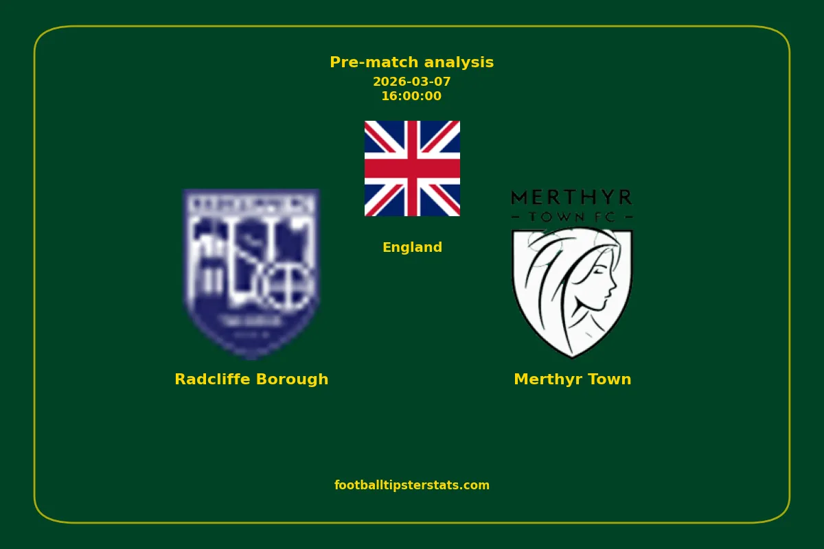 Analyzing the recent performance of Radcliffe Borough and Merthyr Town in England, we can derive insights that may inform future match predictions. By examining their individual game histories, head-to-head encounters, and overall trends, we can identify patterns that highlight strengths and weaknesses for both teams. This comprehensive review aims to provide a clearer understanding of their competitive dynamics and potential outcomes in upcoming fixtures.This pre-match analysis covers the upcoming fixture between Radcliffe Borough and Merthyr Town. Below you’ll find a detailed breakdown of both teams’ recent form, goal statistics, and head-to-head performance. These insights provide a clear picture of current momentum and can be valuable for match forecasting, tactical evaluation, or betting analysis. Please note that these suggestions are based on historical data and trends. While they provide valuable insights, actual match outcomes can be influenced by various unpredictable factors. Always consider multiple aspects before making any decisions based on these analyses.