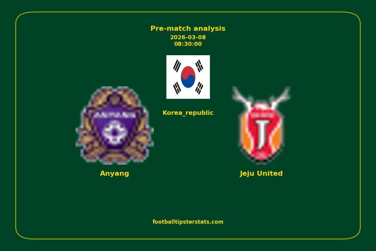 Analyzing the recent performance of Anyang and Jeju United in Korea_republic, we can derive insights that may inform future match predictions. By examining their individual game histories, head-to-head encounters, and overall trends, we can identify patterns that highlight strengths and weaknesses for both teams. This comprehensive review aims to provide a clearer understanding of their competitive dynamics and potential outcomes in upcoming fixtures.This pre-match analysis covers the upcoming fixture between Anyang and Jeju United. Below you’ll find a detailed breakdown of both teams’ recent form, goal statistics, and head-to-head performance. These insights provide a clear picture of current momentum and can be valuable for match forecasting, tactical evaluation, or betting analysis. Please note that these suggestions are based on historical data and trends. While they provide valuable insights, actual match outcomes can be influenced by various unpredictable factors. Always consider multiple aspects before making any decisions based on these analyses.