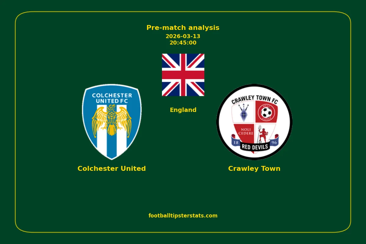 Analyzing the recent performance of Colchester United and Crawley Town in England, we can derive insights that may inform future match predictions. By examining their individual game histories, head-to-head encounters, and overall trends, we can identify patterns that highlight strengths and weaknesses for both teams. This comprehensive review aims to provide a clearer understanding of their competitive dynamics and potential outcomes in upcoming fixtures.This pre-match analysis covers the upcoming fixture between Colchester United and Crawley Town. Below you’ll find a detailed breakdown of both teams’ recent form, goal statistics, and head-to-head performance. These insights provide a clear picture of current momentum and can be valuable for match forecasting, tactical evaluation, or betting analysis. Please note that these suggestions are based on historical data and trends. While they provide valuable insights, actual match outcomes can be influenced by various unpredictable factors. Always consider multiple aspects before making any decisions based on these analyses.