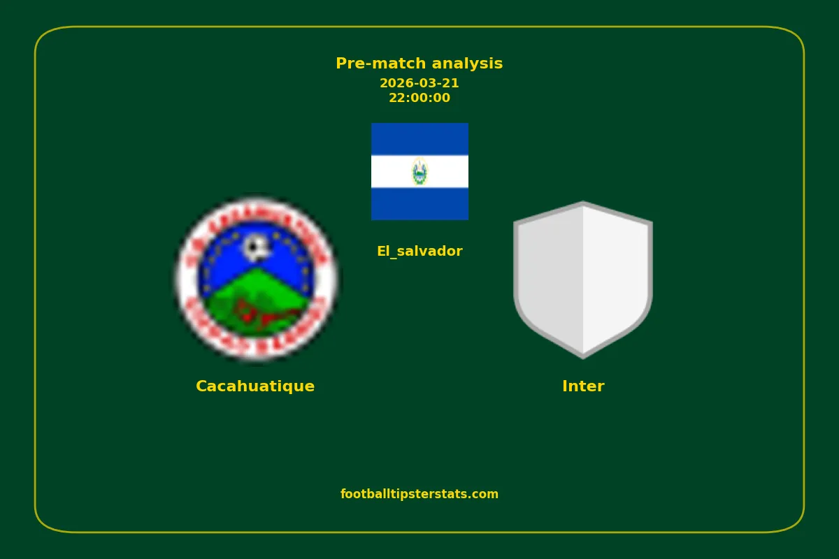 Analyzing the recent performance of Cacahuatique and Inter in El_salvador, we can derive insights that may inform future match predictions. By examining their individual game histories, head-to-head encounters, and overall trends, we can identify patterns that highlight strengths and weaknesses for both teams. This comprehensive review aims to provide a clearer understanding of their competitive dynamics and potential outcomes in upcoming fixtures.This pre-match analysis covers the upcoming fixture between Cacahuatique and Inter. Below you’ll find a detailed breakdown of both teams’ recent form, goal statistics, and head-to-head performance. These insights provide a clear picture of current momentum and can be valuable for match forecasting, tactical evaluation, or betting analysis. Please note that these suggestions are based on historical data and trends. While they provide valuable insights, actual match outcomes can be influenced by various unpredictable factors. Always consider multiple aspects before making any decisions based on these analyses.