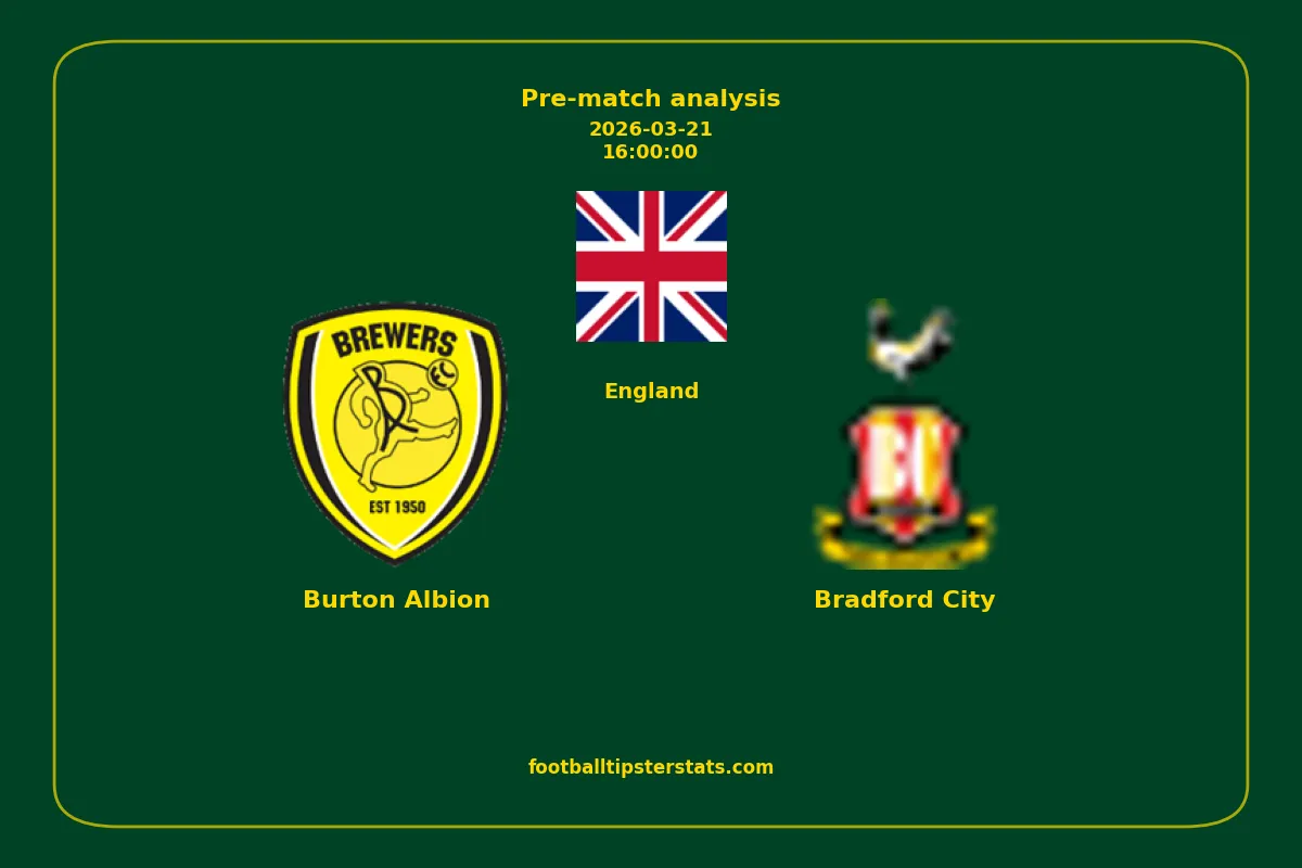 Analyzing the recent performance of Burton Albion and Bradford City in England, we can derive insights that may inform future match predictions. By examining their individual game histories, head-to-head encounters, and overall trends, we can identify patterns that highlight strengths and weaknesses for both teams. This comprehensive review aims to provide a clearer understanding of their competitive dynamics and potential outcomes in upcoming fixtures.This pre-match analysis covers the upcoming fixture between Burton Albion and Bradford City. Below you’ll find a detailed breakdown of both teams’ recent form, goal statistics, and head-to-head performance. These insights provide a clear picture of current momentum and can be valuable for match forecasting, tactical evaluation, or betting analysis. Please note that these suggestions are based on historical data and trends. While they provide valuable insights, actual match outcomes can be influenced by various unpredictable factors. Always consider multiple aspects before making any decisions based on these analyses.