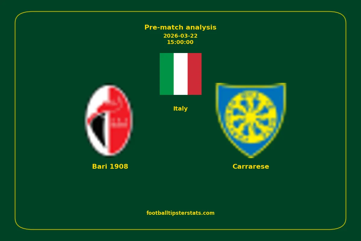 Analyzing the recent performance of Bari 1908 and Carrarese in Italy, we can derive insights that may inform future match predictions. By examining their individual game histories, head-to-head encounters, and overall trends, we can identify patterns that highlight strengths and weaknesses for both teams. This comprehensive review aims to provide a clearer understanding of their competitive dynamics and potential outcomes in upcoming fixtures.This pre-match analysis covers the upcoming fixture between Bari 1908 and Carrarese. Below you’ll find a detailed breakdown of both teams’ recent form, goal statistics, and head-to-head performance. These insights provide a clear picture of current momentum and can be valuable for match forecasting, tactical evaluation, or betting analysis. Please note that these suggestions are based on historical data and trends. While they provide valuable insights, actual match outcomes can be influenced by various unpredictable factors. Always consider multiple aspects before making any decisions based on these analyses.