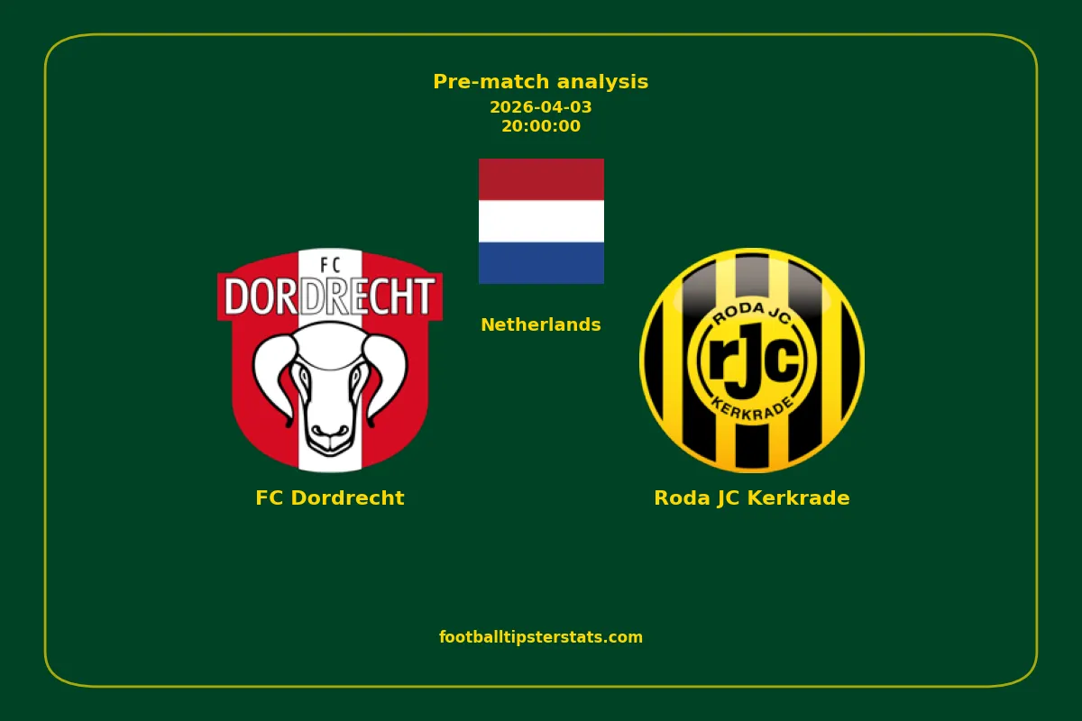 Analyzing the recent performance of FC Dordrecht and Roda JC Kerkrade in Netherlands, we can derive insights that may inform future match predictions. By examining their individual game histories, head-to-head encounters, and overall trends, we can identify patterns that highlight strengths and weaknesses for both teams. This comprehensive review aims to provide a clearer understanding of their competitive dynamics and potential outcomes in upcoming fixtures.This pre-match analysis covers the upcoming fixture between FC Dordrecht and Roda JC Kerkrade. Below you’ll find a detailed breakdown of both teams’ recent form, goal statistics, and head-to-head performance. These insights provide a clear picture of current momentum and can be valuable for match forecasting, tactical evaluation, or betting analysis. Please note that these suggestions are based on historical data and trends. While they provide valuable insights, actual match outcomes can be influenced by various unpredictable factors. Always consider multiple aspects before making any decisions based on these analyses.