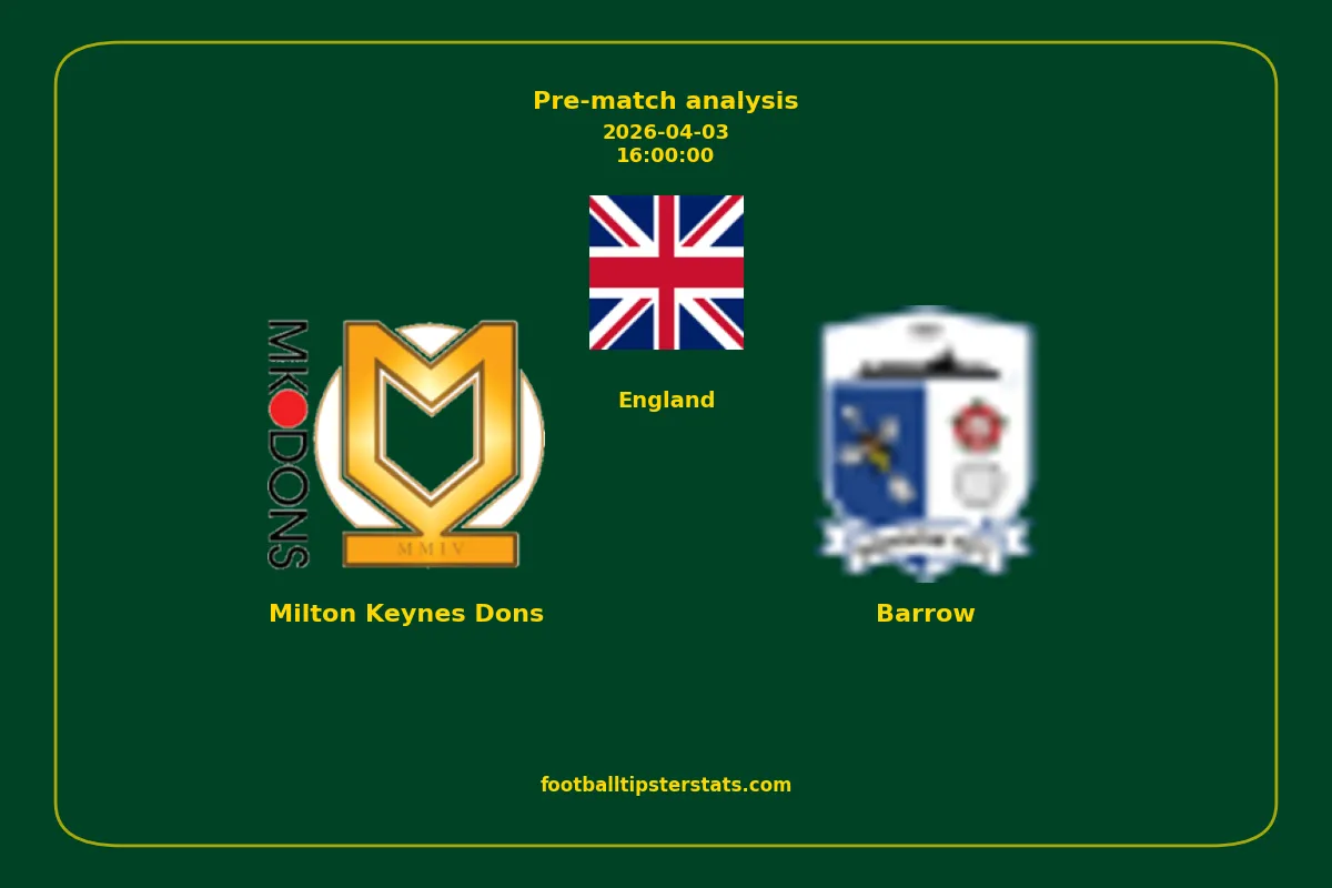 Analyzing the recent performance of Milton Keynes Dons and Barrow in England, we can derive insights that may inform future match predictions. By examining their individual game histories, head-to-head encounters, and overall trends, we can identify patterns that highlight strengths and weaknesses for both teams. This comprehensive review aims to provide a clearer understanding of their competitive dynamics and potential outcomes in upcoming fixtures.This pre-match analysis covers the upcoming fixture between Milton Keynes Dons and Barrow. Below you’ll find a detailed breakdown of both teams’ recent form, goal statistics, and head-to-head performance. These insights provide a clear picture of current momentum and can be valuable for match forecasting, tactical evaluation, or betting analysis. Please note that these suggestions are based on historical data and trends. While they provide valuable insights, actual match outcomes can be influenced by various unpredictable factors. Always consider multiple aspects before making any decisions based on these analyses.