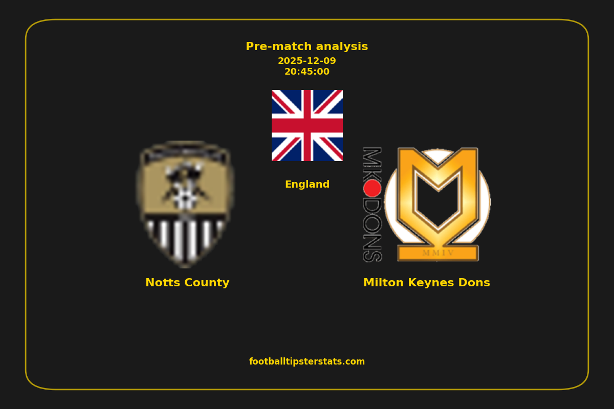 Analyzing the recent performance of Notts County and Milton Keynes Dons in England, we can derive insights that may inform future match predictions. By examining their individual game histories, head-to-head encounters, and overall trends, we can identify patterns that highlight strengths and weaknesses for both teams. This comprehensive review aims to provide a clearer understanding of their competitive dynamics and potential outcomes in upcoming fixtures.This pre-match analysis covers the upcoming fixture between Notts County and Milton Keynes Dons. Below you’ll find a detailed breakdown of both teams’ recent form, goal statistics, and head-to-head performance. These insights provide a clear picture of current momentum and can be valuable for match forecasting, tactical evaluation, or betting analysis. Please note that these suggestions are based on historical data and trends. While they provide valuable insights, actual match outcomes can be influenced by various unpredictable factors. Always consider multiple aspects before making any decisions based on these analyses.