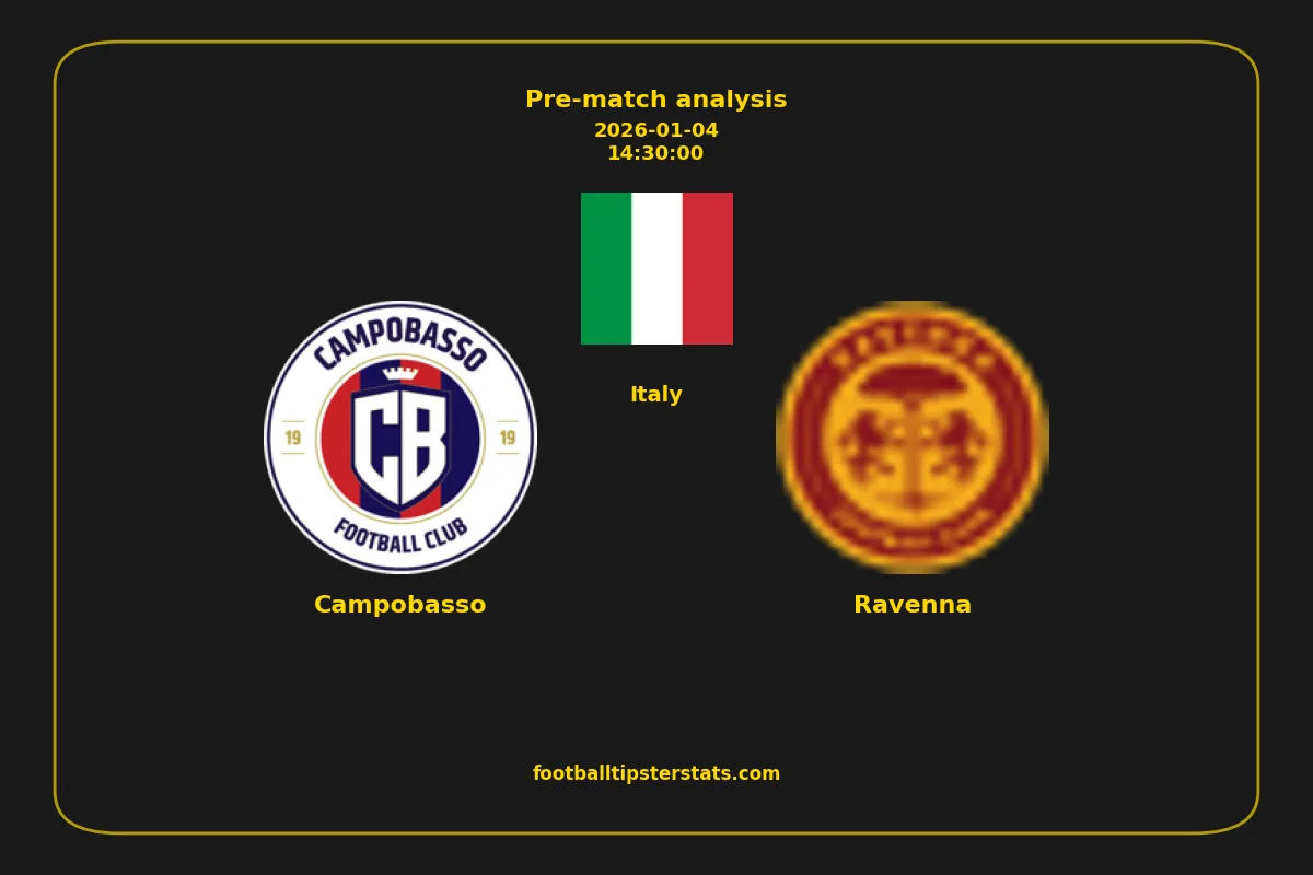 Analyzing the recent performance of Campobasso and Ravenna in Italy, we can derive insights that may inform future match predictions. By examining their individual game histories, head-to-head encounters, and overall trends, we can identify patterns that highlight strengths and weaknesses for both teams. This comprehensive review aims to provide a clearer understanding of their competitive dynamics and potential outcomes in upcoming fixtures.This pre-match analysis covers the upcoming fixture between Campobasso and Ravenna. Below you’ll find a detailed breakdown of both teams’ recent form, goal statistics, and head-to-head performance. These insights provide a clear picture of current momentum and can be valuable for match forecasting, tactical evaluation, or betting analysis. Please note that these suggestions are based on historical data and trends. While they provide valuable insights, actual match outcomes can be influenced by various unpredictable factors. Always consider multiple aspects before making any decisions based on these analyses.
