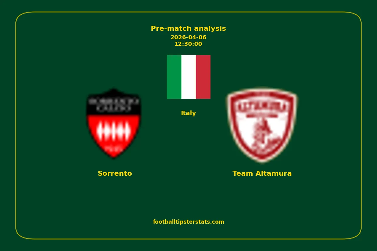 Analyzing the recent performance of Sorrento and Team Altamura in Italy, we can derive insights that may inform future match predictions. By examining their individual game histories, head-to-head encounters, and overall trends, we can identify patterns that highlight strengths and weaknesses for both teams. This comprehensive review aims to provide a clearer understanding of their competitive dynamics and potential outcomes in upcoming fixtures.This pre-match analysis covers the upcoming fixture between Sorrento and Team Altamura. Below you’ll find a detailed breakdown of both teams’ recent form, goal statistics, and head-to-head performance. These insights provide a clear picture of current momentum and can be valuable for match forecasting, tactical evaluation, or betting analysis. Please note that these suggestions are based on historical data and trends. While they provide valuable insights, actual match outcomes can be influenced by various unpredictable factors. Always consider multiple aspects before making any decisions based on these analyses.