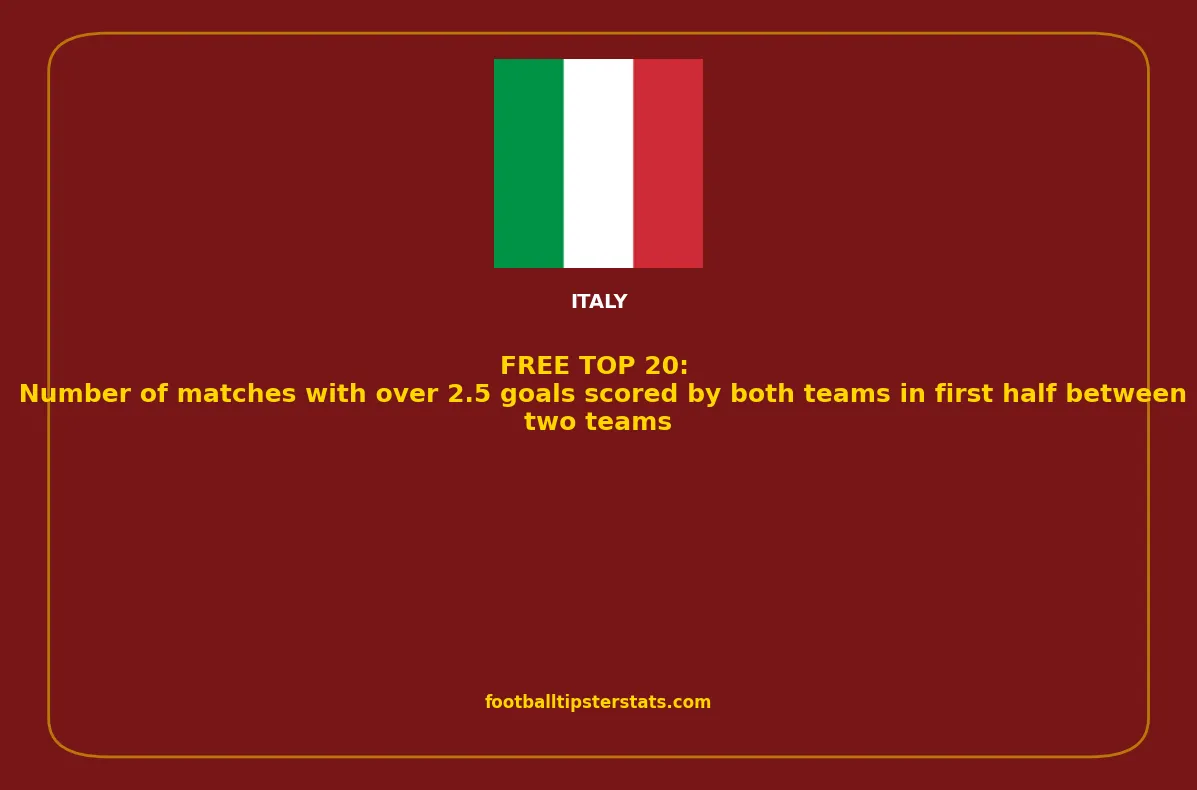 Here is a detailed overview of the teams with the highest number of matches with over 2.5 goals scored by both teams in first half between two teams in Italy. This list highlights clubs that consistently produce high-scoring games, based on recent statistical performance. Whether you're analyzing trends, preparing betting strategies, or simply exploring offensive team profiles, these numbers offer a clear insight into which teams generate the most goal-rich matches.