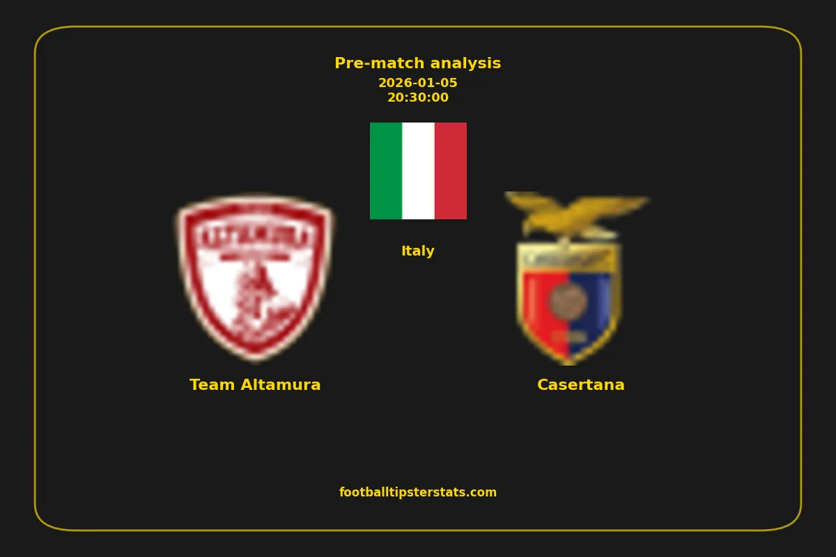 Analyzing the recent performance of Team Altamura and Casertana in Italy, we can derive insights that may inform future match predictions. By examining their individual game histories, head-to-head encounters, and overall trends, we can identify patterns that highlight strengths and weaknesses for both teams. This comprehensive review aims to provide a clearer understanding of their competitive dynamics and potential outcomes in upcoming fixtures.This pre-match analysis covers the upcoming fixture between Team Altamura and Casertana. Below you’ll find a detailed breakdown of both teams’ recent form, goal statistics, and head-to-head performance. These insights provide a clear picture of current momentum and can be valuable for match forecasting, tactical evaluation, or betting analysis. Please note that these suggestions are based on historical data and trends. While they provide valuable insights, actual match outcomes can be influenced by various unpredictable factors. Always consider multiple aspects before making any decisions based on these analyses.
