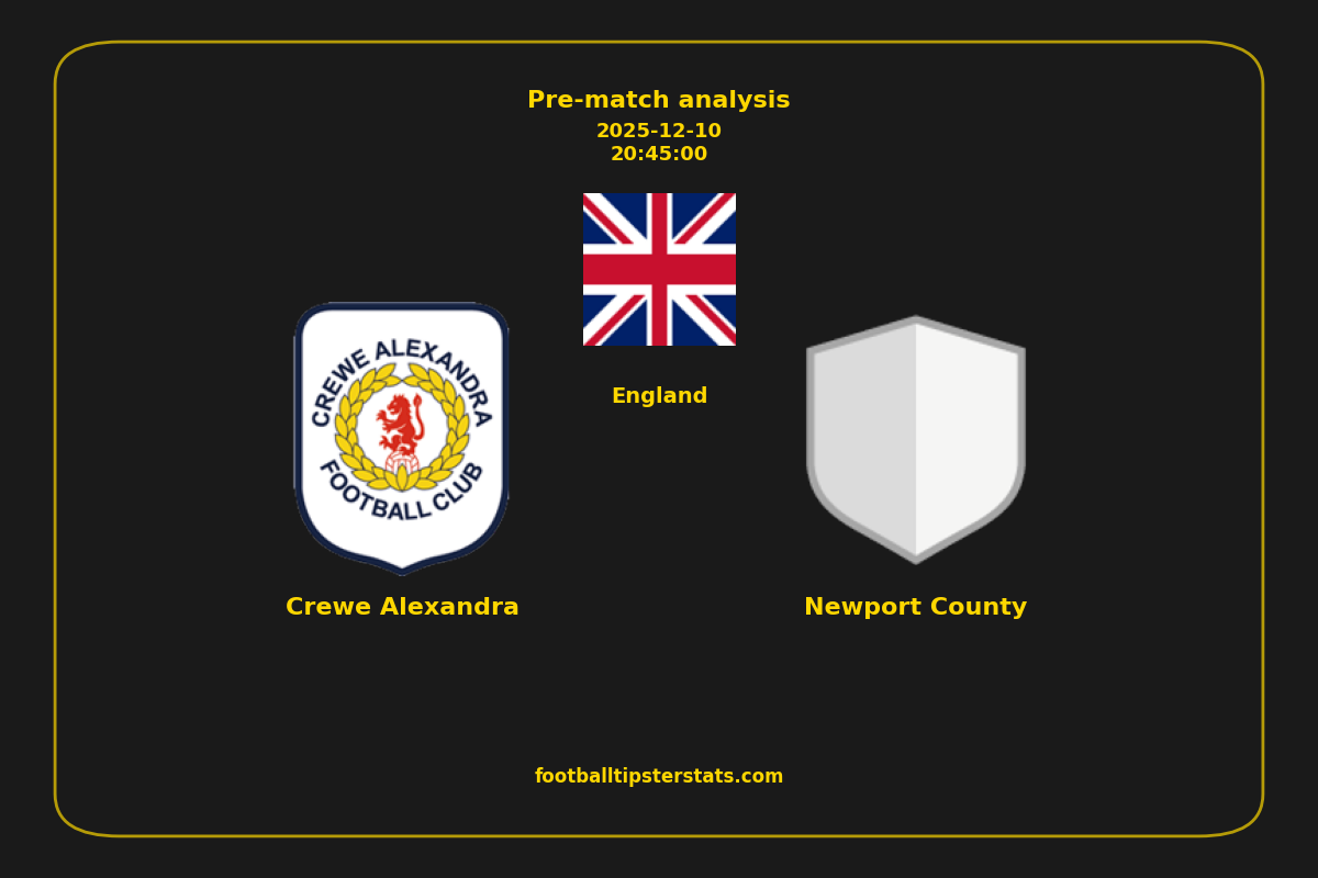 Analyzing the recent performance of Crewe Alexandra and Newport County in England, we can derive insights that may inform future match predictions. By examining their individual game histories, head-to-head encounters, and overall trends, we can identify patterns that highlight strengths and weaknesses for both teams. This comprehensive review aims to provide a clearer understanding of their competitive dynamics and potential outcomes in upcoming fixtures.This pre-match analysis covers the upcoming fixture between Crewe Alexandra and Newport County. Below you’ll find a detailed breakdown of both teams’ recent form, goal statistics, and head-to-head performance. These insights provide a clear picture of current momentum and can be valuable for match forecasting, tactical evaluation, or betting analysis. Please note that these suggestions are based on historical data and trends. While they provide valuable insights, actual match outcomes can be influenced by various unpredictable factors. Always consider multiple aspects before making any decisions based on these analyses.