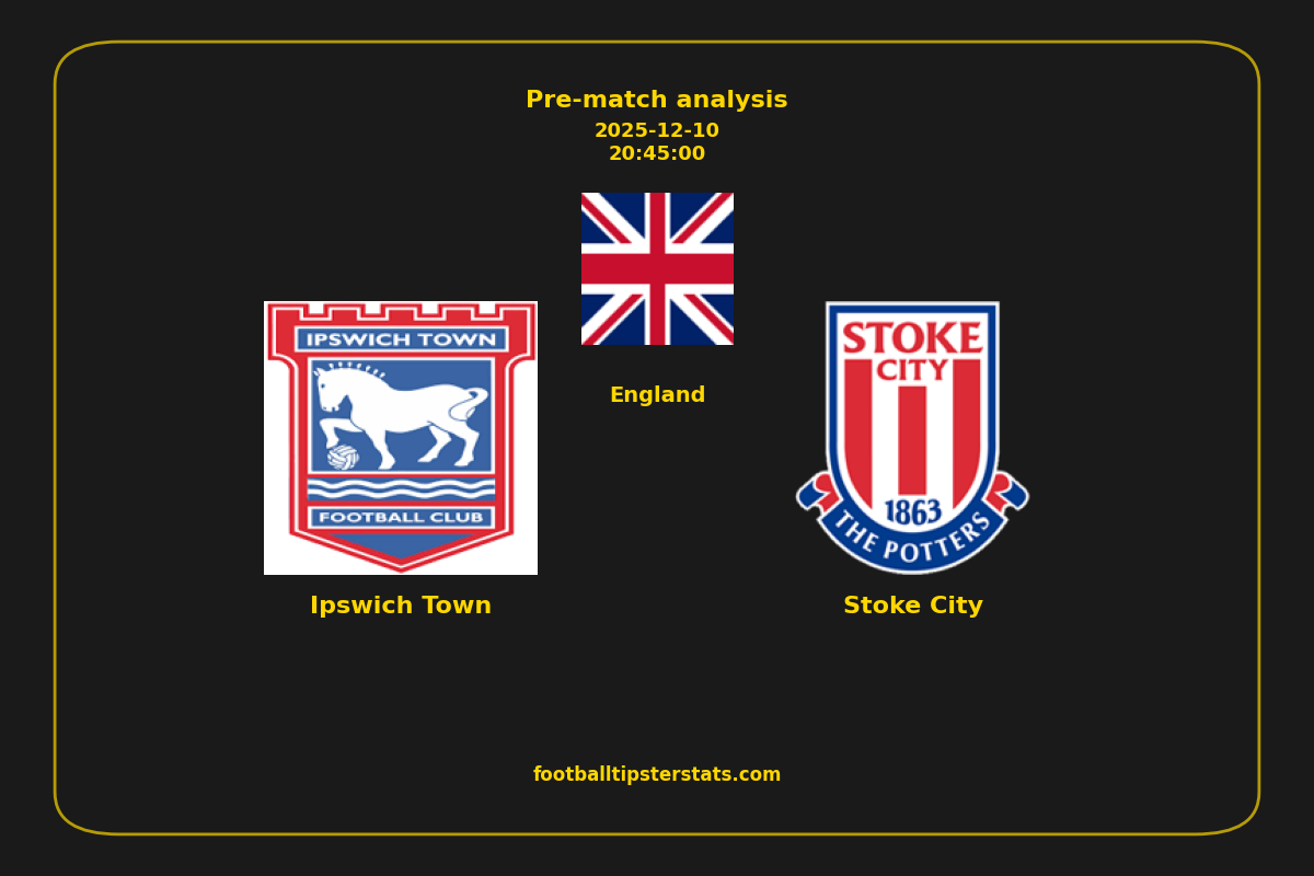 Analyzing the recent performance of Ipswich Town and Stoke City in England, we can derive insights that may inform future match predictions. By examining their individual game histories, head-to-head encounters, and overall trends, we can identify patterns that highlight strengths and weaknesses for both teams. This comprehensive review aims to provide a clearer understanding of their competitive dynamics and potential outcomes in upcoming fixtures.This pre-match analysis covers the upcoming fixture between Ipswich Town and Stoke City. Below you’ll find a detailed breakdown of both teams’ recent form, goal statistics, and head-to-head performance. These insights provide a clear picture of current momentum and can be valuable for match forecasting, tactical evaluation, or betting analysis. Please note that these suggestions are based on historical data and trends. While they provide valuable insights, actual match outcomes can be influenced by various unpredictable factors. Always consider multiple aspects before making any decisions based on these analyses.
